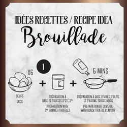 Réalisez des recettes gourmandes et pleines de finesses avec notre kit brouillade à la truffe noire et à la truffe d’été. Une composition de préparation culinaire à base d’huile d’olive et d’arôme de truffe noire et d’une préparation culinaire aromatisée à base de truffe d’été dans son pot 30g.