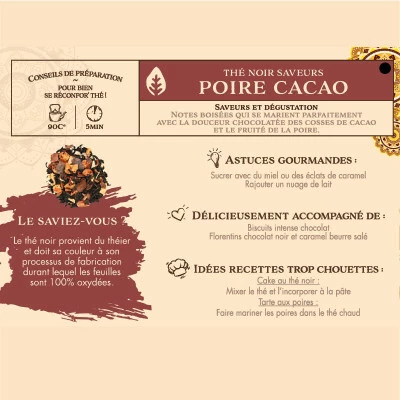 Thé noir, aux notes boisées qui se marient à merveille avec la douceur chocolatée des cosses de cacao et le fruité de la poire